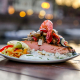 Unser Lachsbraten wird mit Hartkäse gefüllt, der beim Garen nicht schmilzt. Als Topping kommen mediterranes Gemüse, Tomaten, Garnelen und Physalis hinzu, die wir liebevoll garnieren und abstimmen.